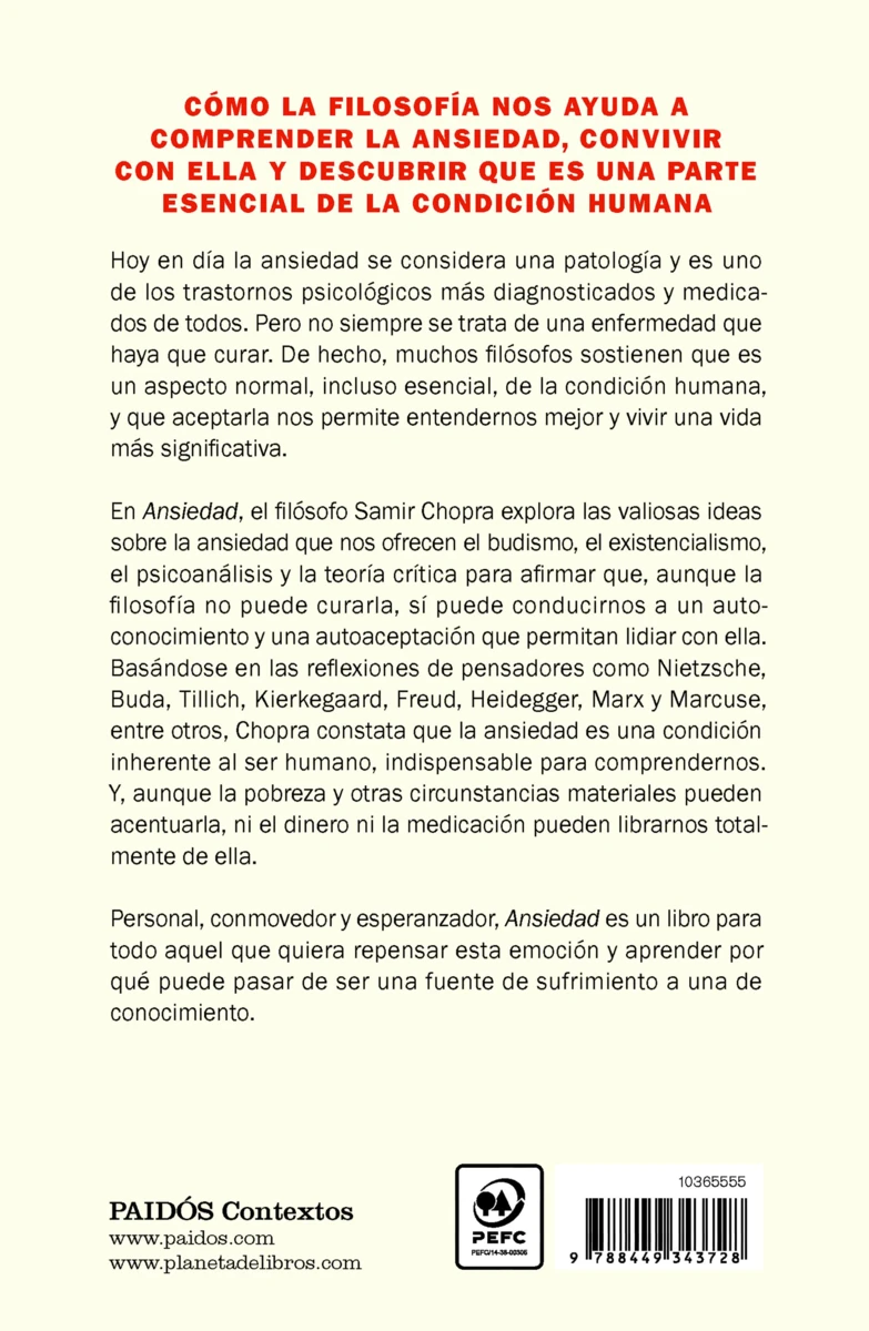 Combinando varias corrientes filosóficas con su experiencia personal y con un lenguaje cercano y muy ameno, Chopra nos invita a reconsiderar y a reconceptualizar la ansiedad para que podamos aceptarla como algo intrínseco de nosotros mismos y afrontarla de manera mucho más eficaz en nuestro día a día.