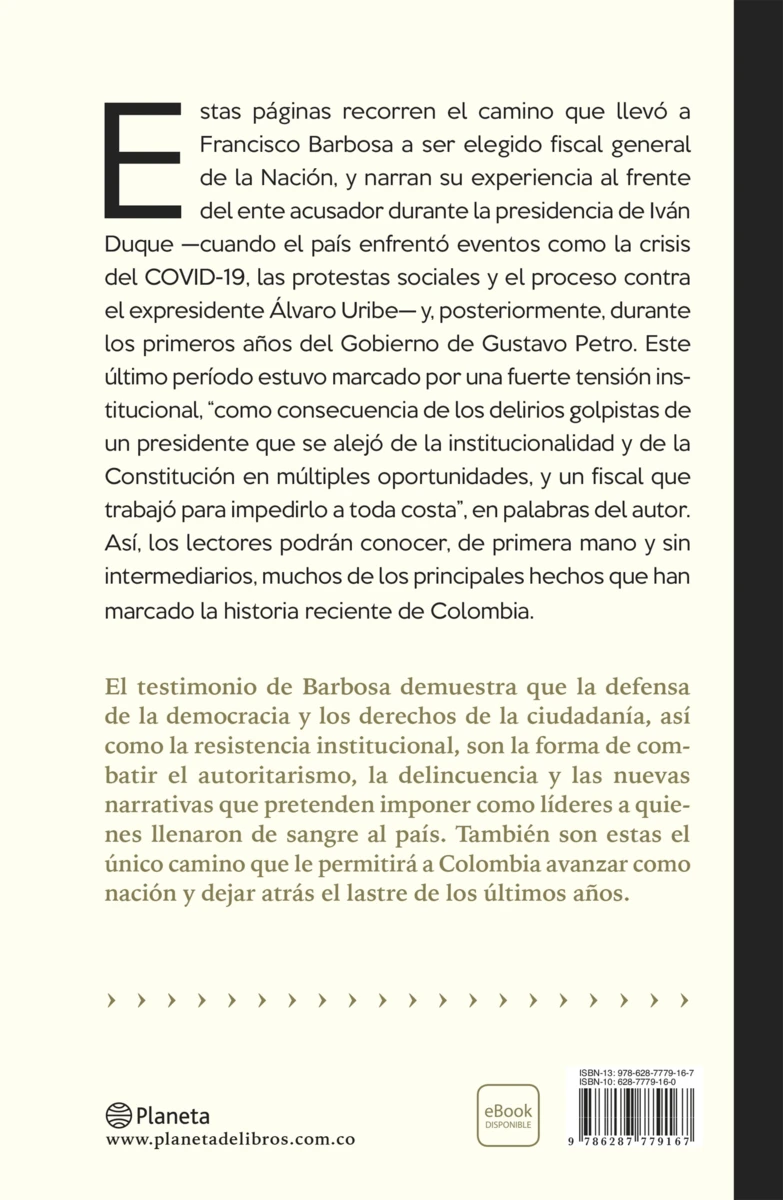 Estas páginas recogen el camino que llevó a Francisco Barbosa a ser elegido fiscal general de la Nación, y narran su experiencia al frente del ente acusador durante la presidencia de Iván Duque —cuando el país enfrentó eventos como la crisis del Covid 19, las protestas sociales y el proceso contra el...