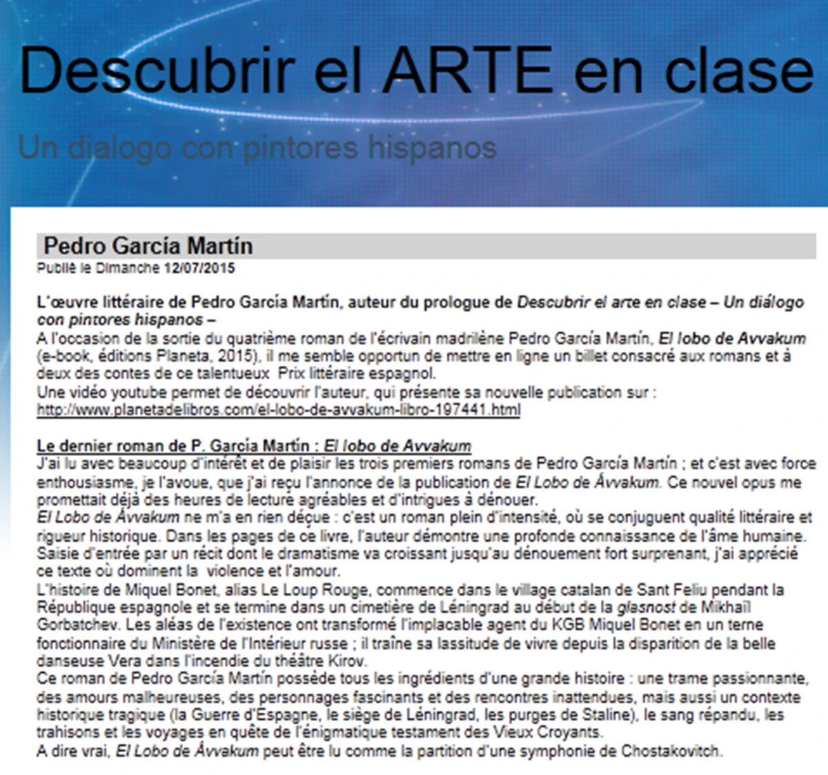 El Lobo de Ávvakum es una novela intensa que conjuga la calidad literaria con el rigor histórico. En estas páginas, el escritor demuestra un profundo conocimiento del alma humana. Atrapada desde el principio por una narración que va creciendo en dramatismo hasta llegar a un final sorprendente, he disfrutado de este relato lleno de violencia y de amor. Esta novela de Pedro García Martín cuenta con todo lo que necesita una gran historia : una trama apasionante, amores desgraciados, fascinantes personajes y encuentros inesperados, pero también un contexto histórico trágico (guerra de España, sitio de Leningrado, purgas de Stalin), sangre derramada, traiciones y viajes en pos del enigmático testamento de los viejos creyentes. A decir verdad, El Lobo de Ávvakum se puede leer como la partitura de una sinfonía de Shostakóvich. Sophie Pelissier