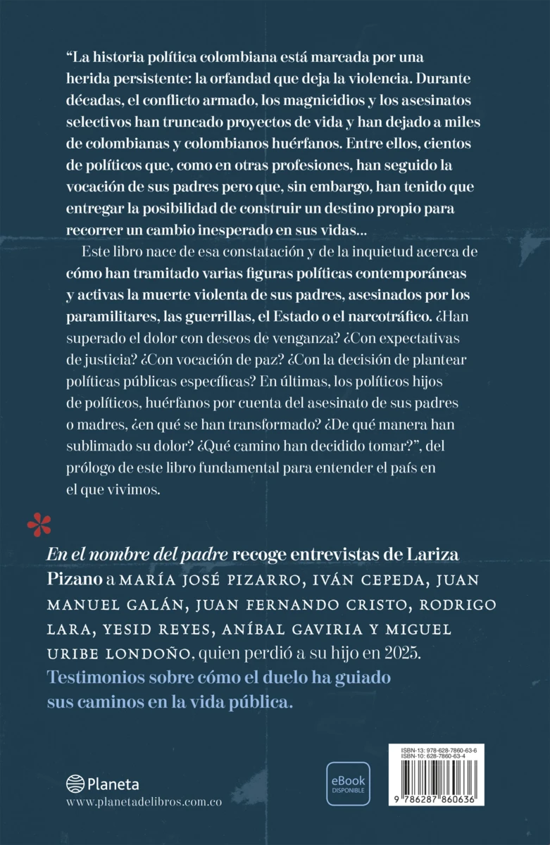 En el nombre del padre recoge entrevistas de Lariza Pizano a María José Pizarro, Iván Cepeda, Juan Manuel Galán, Juan Fernando Cristo, Rodrigo Lara, Yesid Reyes, Aníbal Gaviria y Miguel Uribe Londoño, quien perdió a su hijo en 2025.  Testimonios sobre cómo el duelo ha guiado sus caminos en la vida pública.