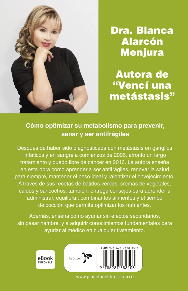 Después de haber sido diagnosticada con metástasis en ganglios linfáticos y en sangre a comienzos de 2006, afrontó un largo tratamiento y quedó libre de cáncer en 2016. La autora enseña en esta obra cómo aprender a ser antifrágiles, renovar la salud para siempre, mantener el peso ideal y ralentizar el envejecimiento. A través de sus recetas de batidos verdes, cremas de...