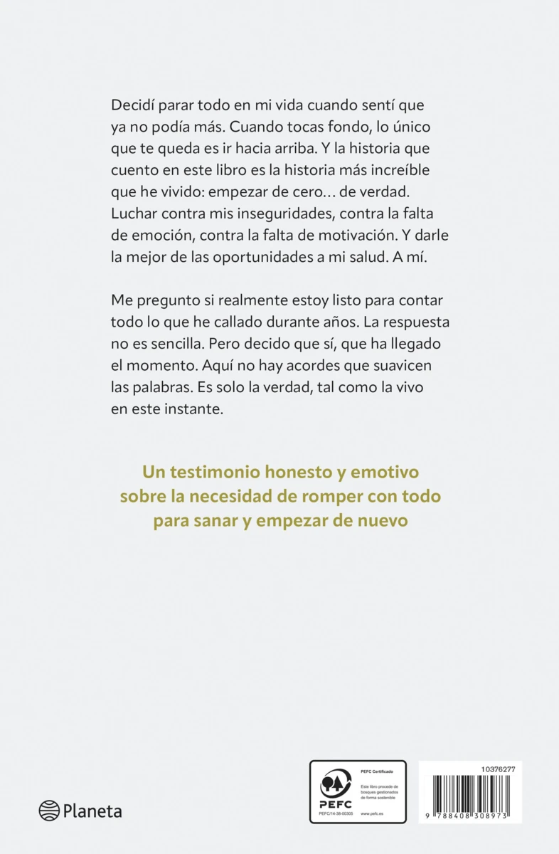 Decidí parar todo en mi vida cuando sentí que ya no podía más. Cuando tocas fondo, lo único que te queda es ir hacia arriba. Y la historia que cuento en este libro es la historia más increíble que he vivido: empezar de cero… de verdad. Luchar contra mis inseguridades, contra la falta de emoción, contra la falta de motivación. Y darle la mejor de las oportunidades a mi salud. A...