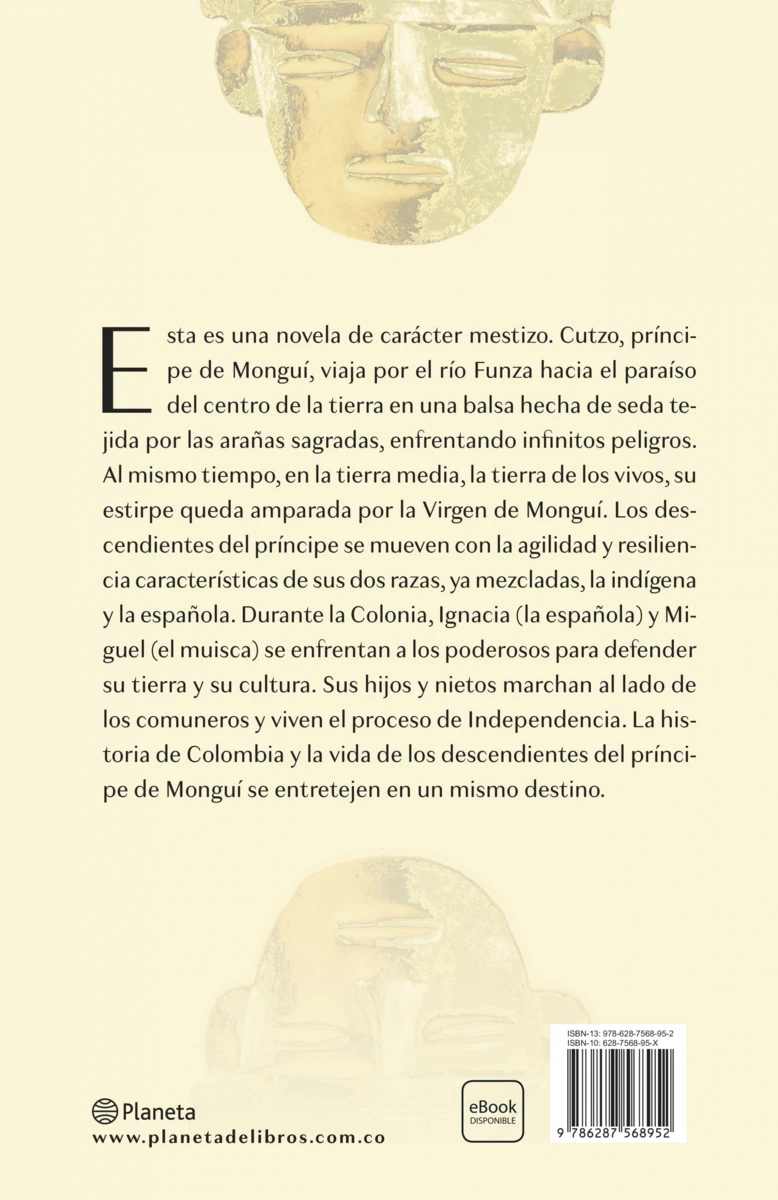 Esta es una novela de carácter mestizo. Cutzo, príncipe de Monguí, viaja por el río Funza hacia el paraíso del centro de la tierra, en una balsa hecha de seda tejida por las arañas sagradas, enfrentando infinitos peligros. Al mismo tiempo, en la tierra media, la tierra de los vivos, su estirpe queda amparada por la Virgen de Monguí. Los descendientes del príncipe se mueven con la agilidad...