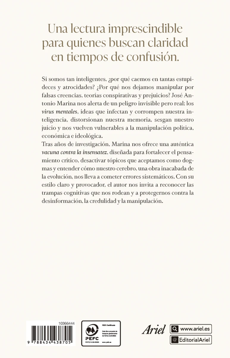 Si somos tan inteligentes, ¿por qué caemos en tantas estupideces y atrocidades? ¿Por qué nos dejamos manipular por falsas creencias, teorías conspirativas y prejuicios? José Antonio Marina nos alerta de un peligro invisible pero real: los virus mentales, ideas que infectan y corrompen nuestra inteligencia, distorsionan nuestra memoria, sesgan nuestro...