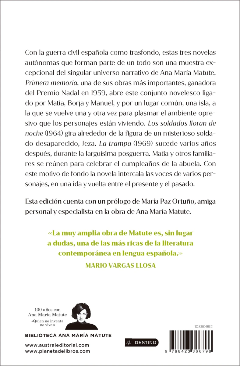 Con la guerra civil española como trasfondo, estas tres novelas autónomas que forman parte de un todo son una muestra excepcional del singular universo narrativo de Ana María Matute. Primera memoria, una de sus novelas más importantes abre este conjunto novelesco ligado por Matia, Borja y Manuel, y por un lugar común, una isla, a...