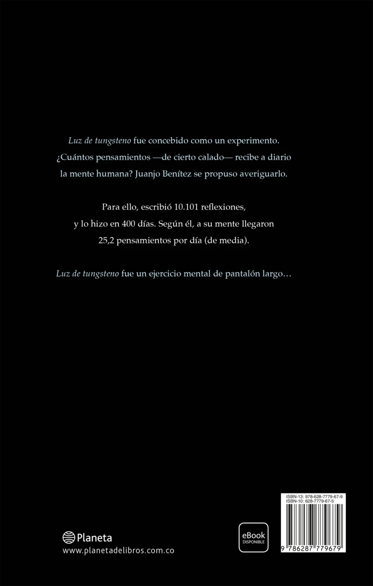 Luz de tungsteno fue concebido como un experimento. ¿Cuántos pensamientos —de cierto calado— recibe a diario la mente humana? Juanjo Benítez se propuso averiguarlo.  Para ello, escribió 10.101 reflexiones, y lo hizo en 400 días. Según él, a su mente llegaron 25,2 pensamientos por...