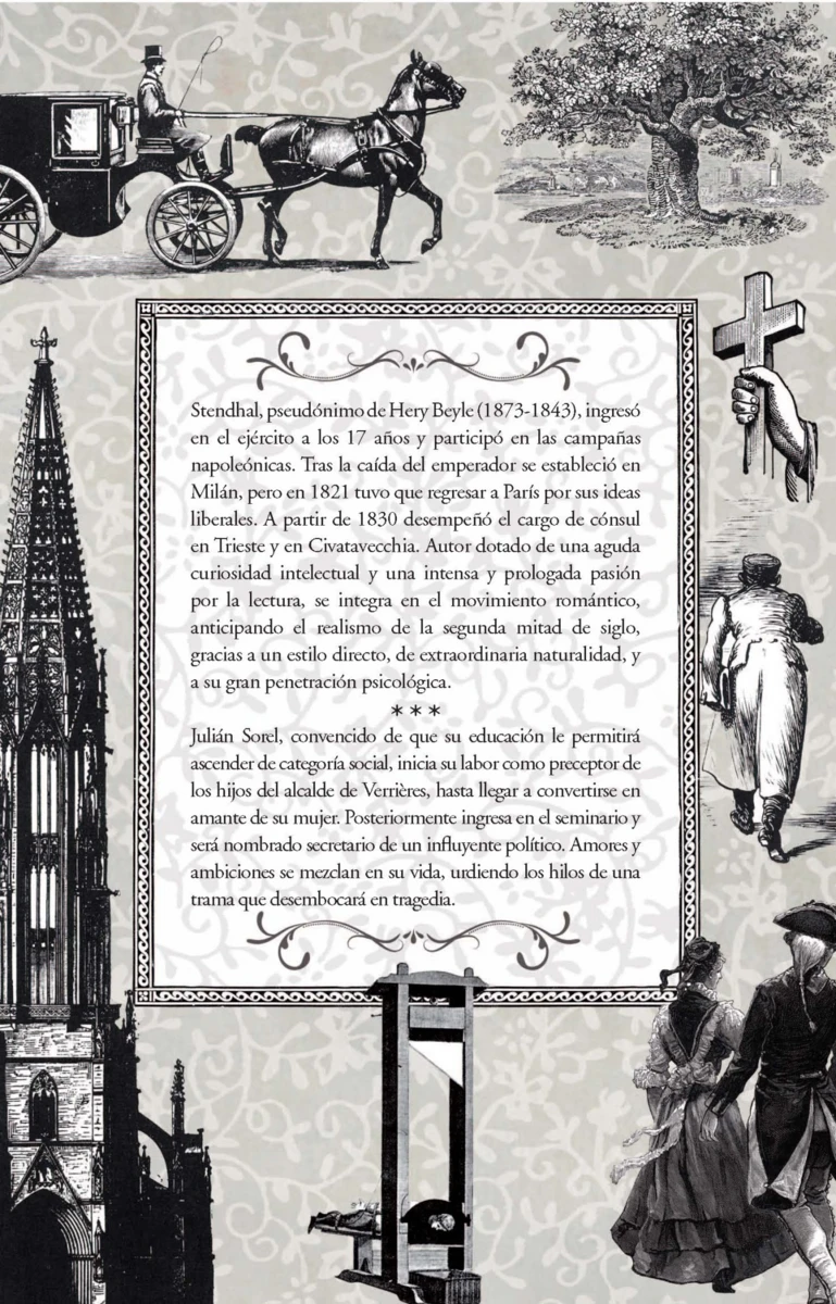 Julián Sorel, convencido de que su educación le permitirá ascender de categoría social, inicia su labor como preceptor de los hijos del alcalde de Verrières, hasta llegar a convertirse en amante de su mujer. Posteriormente ingresa en el seminario y será nombrado secretario de un influyente político. Amores y ambiciones se mezclan en su vida, urdiendo los hilos de una trama que...