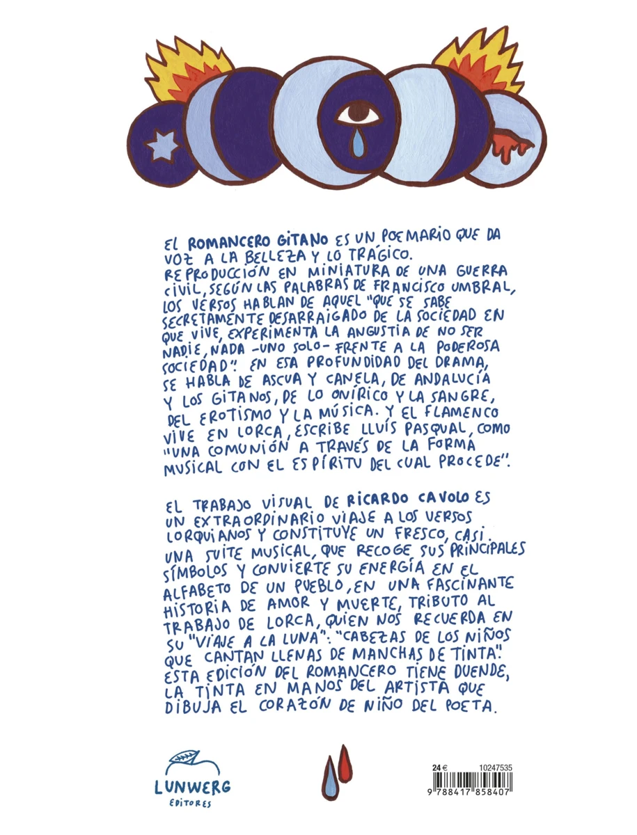 «Federico García Lorca y Ricardo Cavolo "conversan" en este nuevo "Romancero Gitano" que, como las obras de Shakespeare, no ha perdido un ápice de actualidad, pese a haber sido escrito hace casi cien años. El ilustrador salmantino interpreta con maestría el particular lenguaje simbólico de Lorca, con unos personajes, los gitanos, donde destacan sus ojos tristes y los colores vivos característicos del estilo de Cavolo».