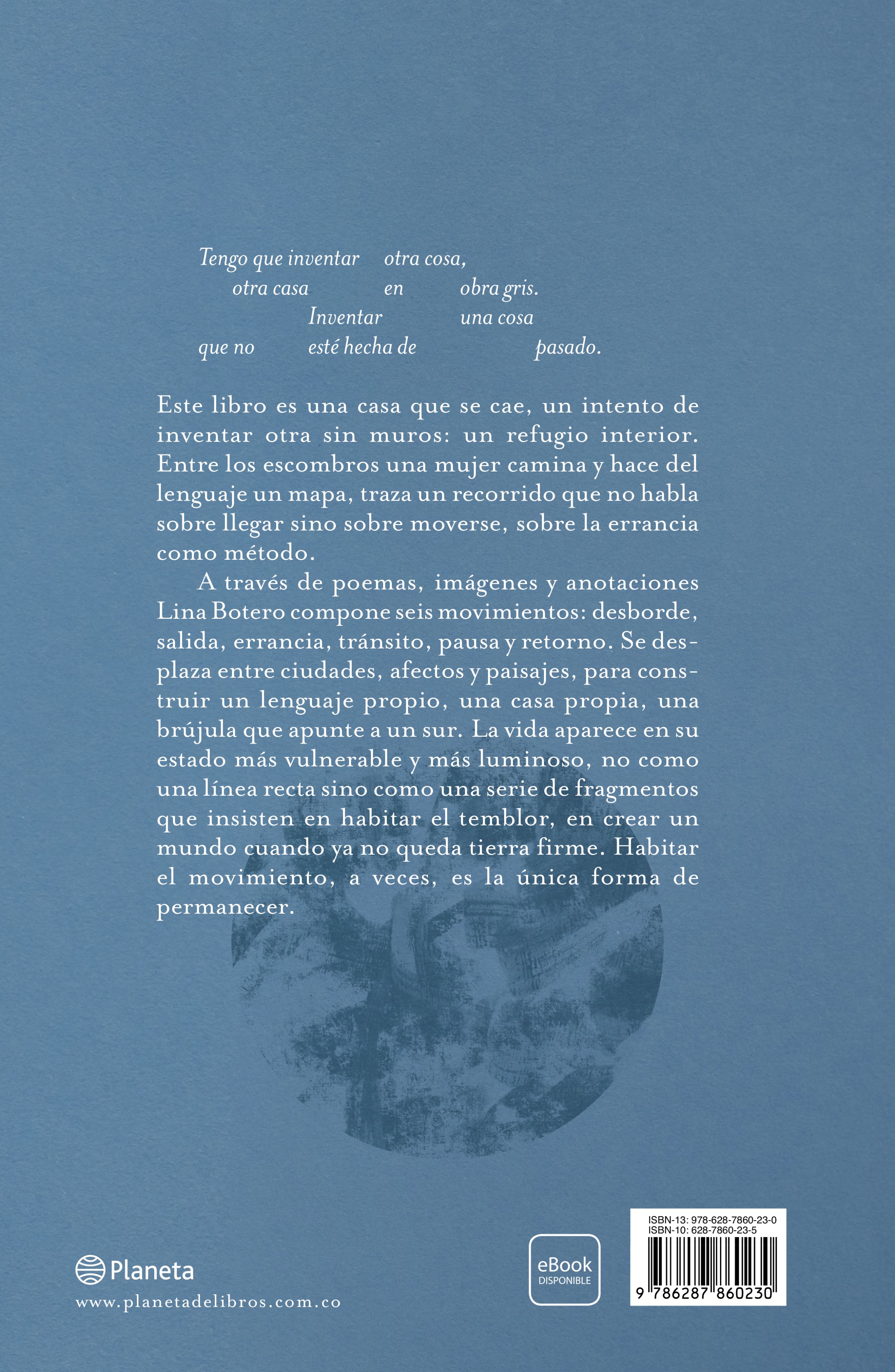 Este libro es una casa que se cae, un intento de inventar otra sin muros: un refugio interior. Entre los escombros una mujer camina y hace del lenguaje un mapa, traza un recorrido que no habla sobre llegar sino sobre...