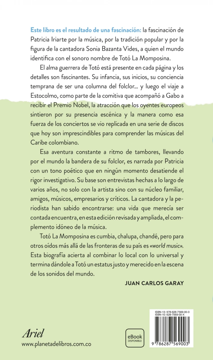 Este libro es el resultado de una fascinación: la fascinación de Patricia Iriarte por la música, por la tradición popular y por la figura de la cantadora Sonia Bazanta Vides, a quien el mundo identifica con el sonoro nombre de Totó La Momposina.